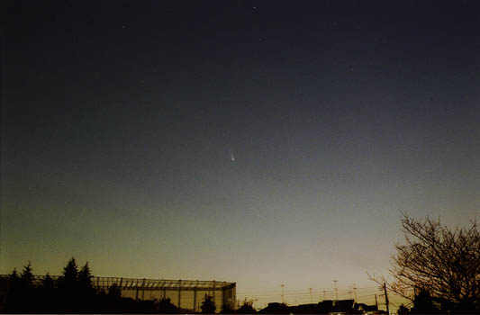 中央のゴミ見たいのが、ヘール・ボップ彗星です。 撮影時刻、1997年3月13日午前5時10分ごろ。 撮影地は東京都町田市、自宅前。 カメラはニコンF3、レンズは28ミリ、フィルムは富士スーパーG400(1段増感) 露光時間30秒で絞り2.8(解放)。